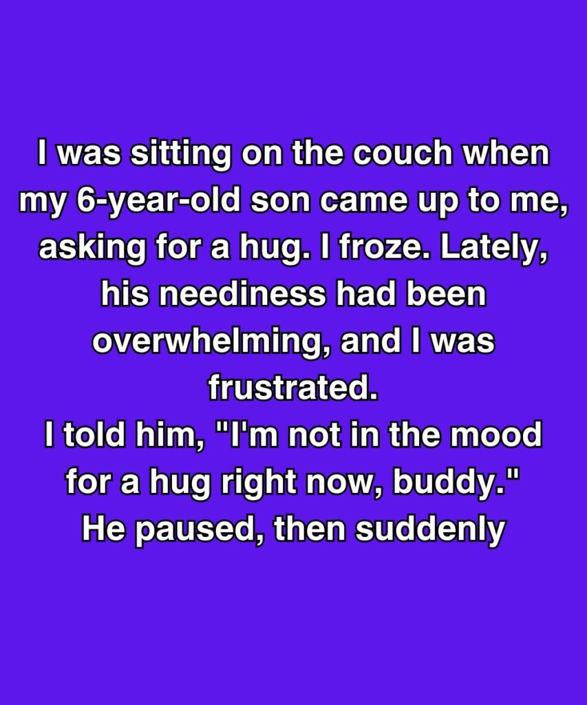 I was on the couch when my 6-year-old padded over and asked for a hug. I’d had one of those days—short fuse, long list—and I said, “Not right now, buddy.”