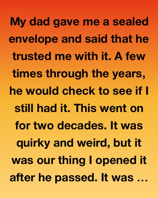 My dad handed me a sealed envelope when I was a kid and said he trusted me with it. No drama, no instructions—just, “Keep this safe.” Every so often over the next twenty years, he’d ask, “You still got it?” I’d nod, or pull it from whatever hiding place it lived in that year—under a mattress, inside a shoe box, back of a drawer. He’d smile, tap it once with two fingers, and that was that. It was quirky and weird, but it was ours.