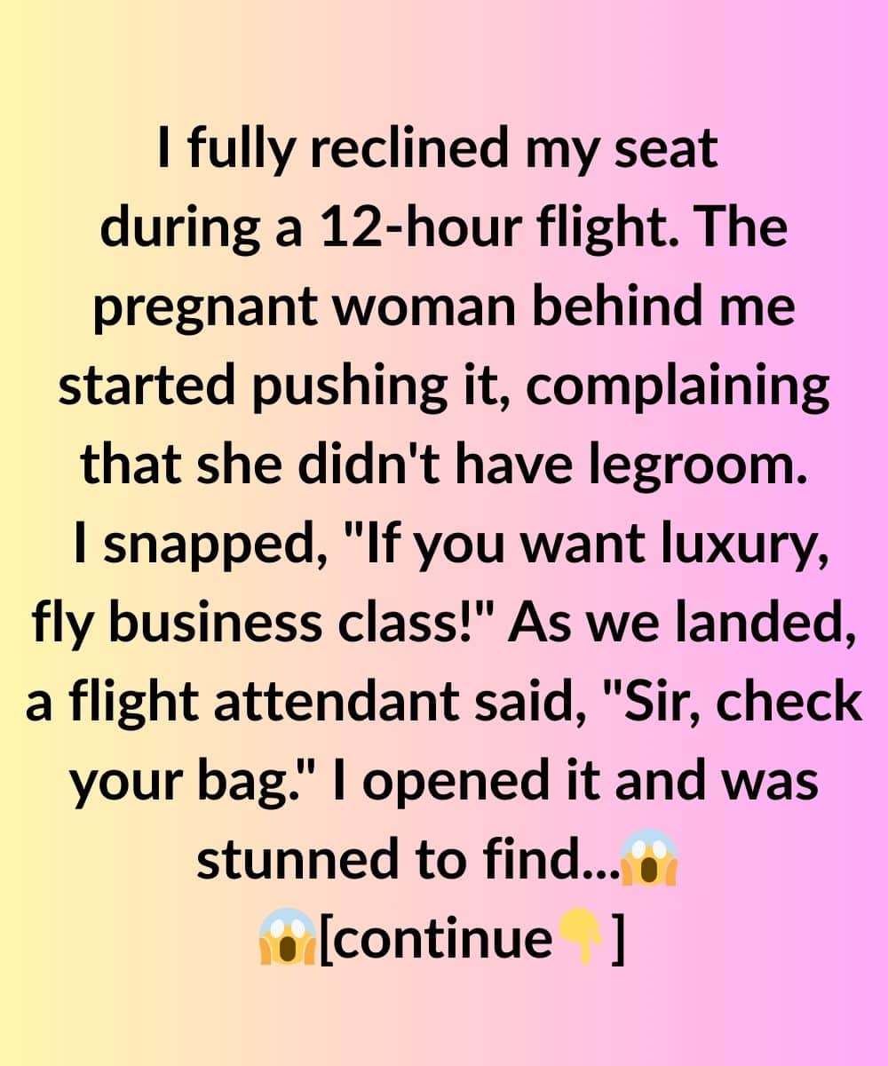 I slammed my seat all the way back on a twelve-hour flight and spent the next hour pretending not to notice the pregnant woman behind me nudging it forward with her knees. When she finally said she didn’t have enough legroom, I took off my headphones just long enough to snap, “If you want luxury, fly business class,” then slid them back on like a curtain.