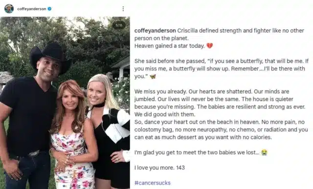 Following Criscilla’s passing, Coffey released a deeply emotional message honoring the woman he had shared his life and family with. His tribute expressed both heartbreak and admiration: