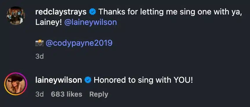 Afterward, The Red Clay Strays shared video of the duet on social media with the caption, “Thanks for letting me sing one with ya, Lainey!”