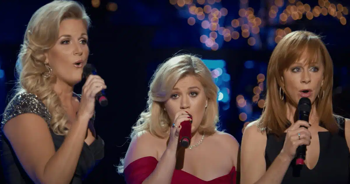 Home » “Over 45 Million Viewers Still Can’t Stop Crying…” That’s how powerful the moment was when Kelly Clarkson, radiant in a stunning red holiday gown, stepped onto the stage beside country legends Trisha Yearwood and Reba McEntire and transformed a simple carol into something holy. What began as Kelly whispering the first soft, trembling notes of “Silent Night” suddenly blossomed into a breathtaking a cappella harmony—Trisha’s warm tenderness weaving into Kelly’s bright, soul-deep clarity, while Reba’s iconic power lifted every note into something that felt like pure Christmas light. The audience didn’t just listen—they felt it. People clutched their chests, wiping tears, whispering emotional lines like “I can feel every childhood memory in their voices…” and “This is what love sounds like.” Even music legends were shaken. Dolly Parton, moved beyond words, reportedly whispered, “This is heaven, right here on earth.” Andrea Bocelli called it, “A moment where voices became prayer.”