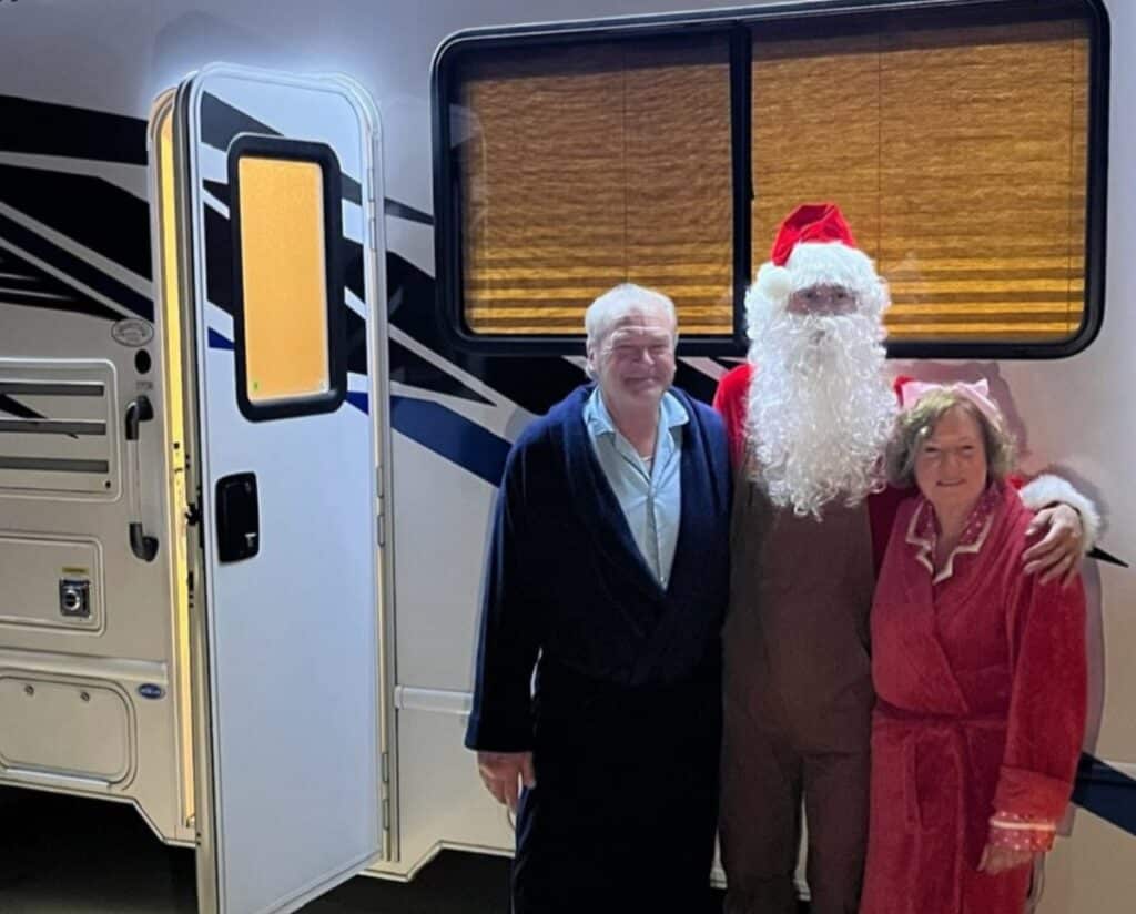 According to Karen’s Instagram post, the couple won the costume contest and were rewarded with a brand-new camper, complete with photos of them celebrating alongside Riley — who was dressed as Santa while handing over the keys. She joked that it was Riley’s clever way of getting them off his bus, adding that they’re officially ready for life on the road.
