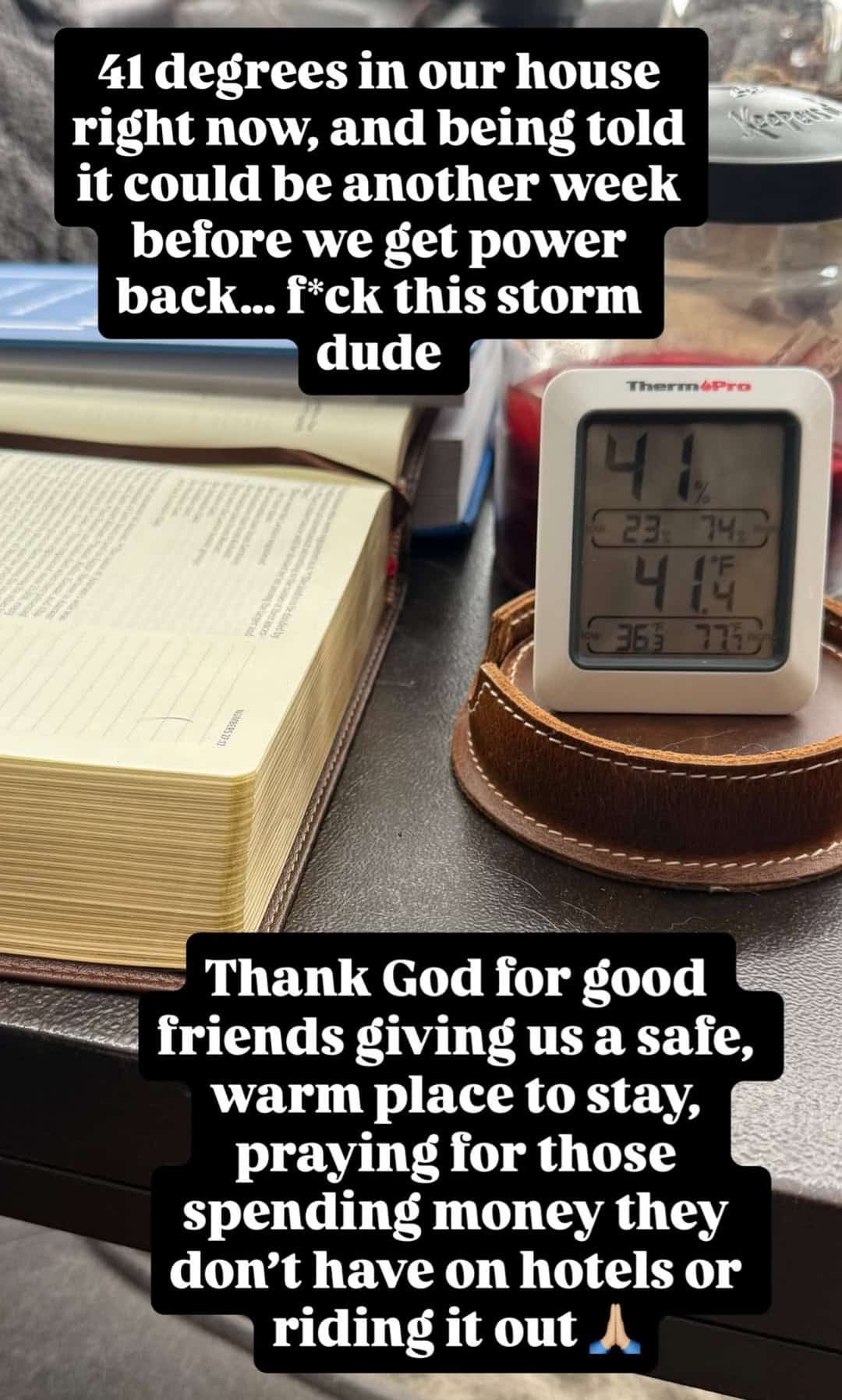 “Thank God for friends who’ve given us a warm, safe place to stay,” she wrote. “Praying for everyone who’s spending money they don’t have on hotels or trying to ride this out.”