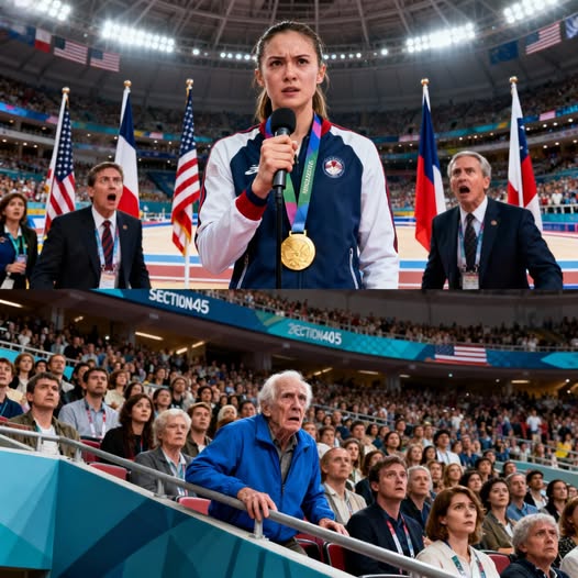 Maya Porter, newly crowned gold medalist, stood on the podium beneath bright arena lights. Her floor routine had been flawless—disciplined power carried by quiet confidence. As officials prepared for the ceremony, she reached for the microphone.