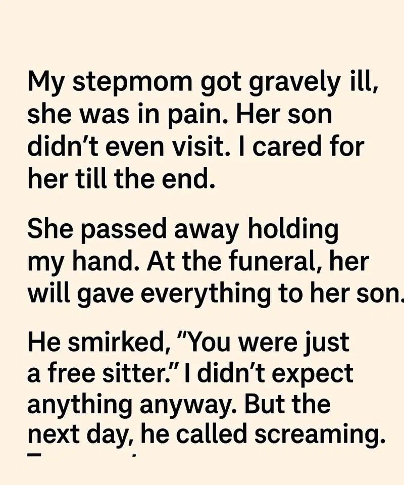 In the letter, she had written gently. She thanked me for the small things I had done during the final months of her illness—sitting with her when the house felt too quiet, listening when the pain made her restless, speaking calmly when she felt afraid.
