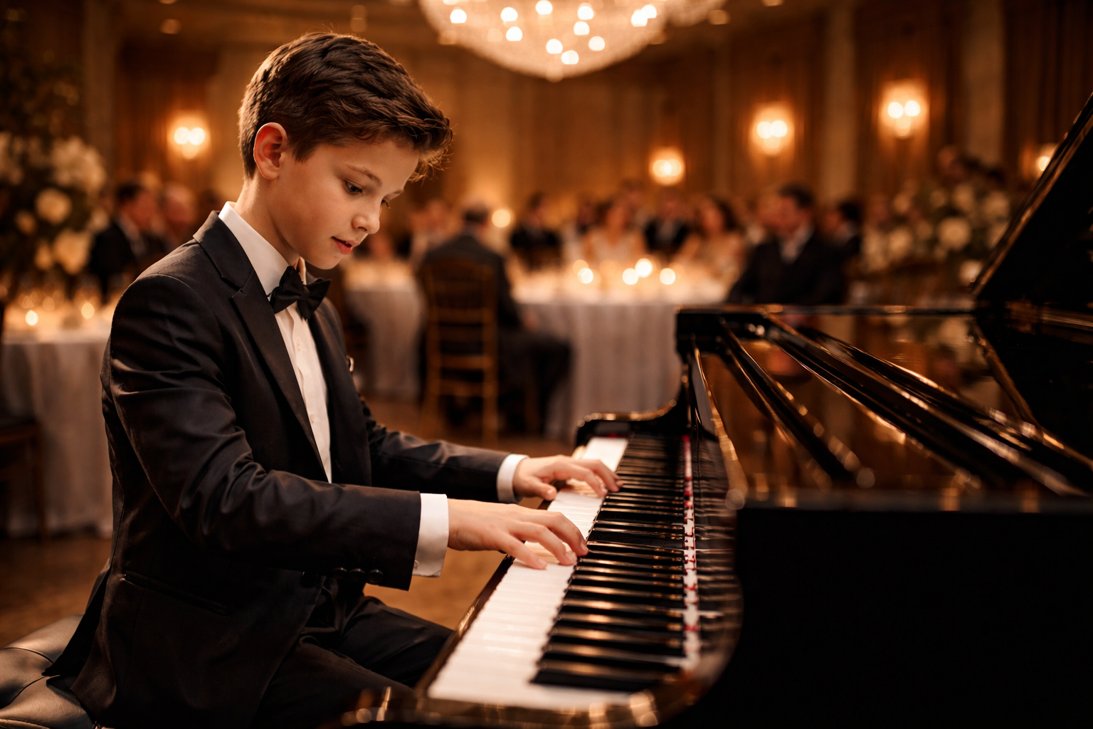 The chandelier lights shimmered like frozen stars above the grand hall, casting warm gold across polished marble floors. Crystal glasses caught the glow from every angle, and soft laughter floated beneath the high ceilings.